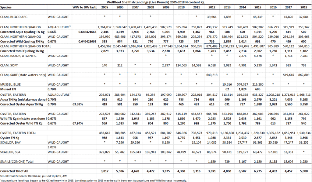 (Updated 4.28.20) How much nitrogen is currently being extracted from Wellfleet Harbor when our shellfish are harvested? Shellfish contain nitrogen within in their meats and their shells. In shellfish, meat nitrogen is stored in proteins, and in their gut primarily as chlorophyll that they are feeding on. Their shells also contain nitrogen. When shellfish are harvested and removed from the water, the nitrogen that they contain is removed, simple really. The total nitrogen content varies to some extent, based on their growing conditions and location. It is important to note that no two locations are exactly the same. Also, this calculation is solely counting the total weight of the nitrogen when the shellfish are landed. It does not include, denitrification, burial, or export