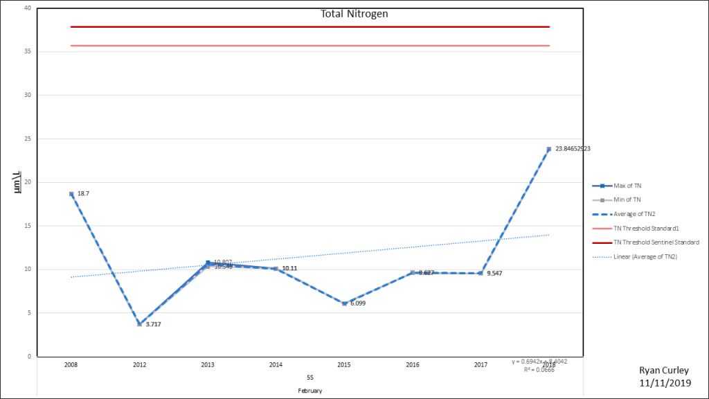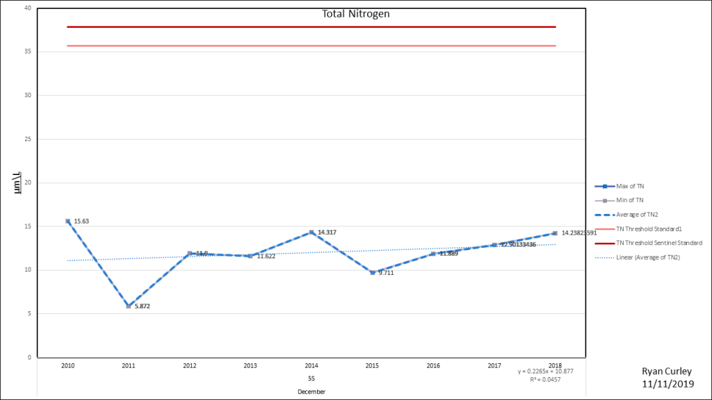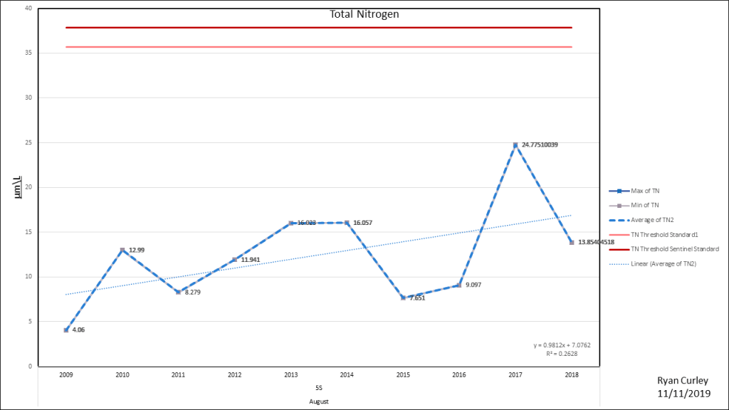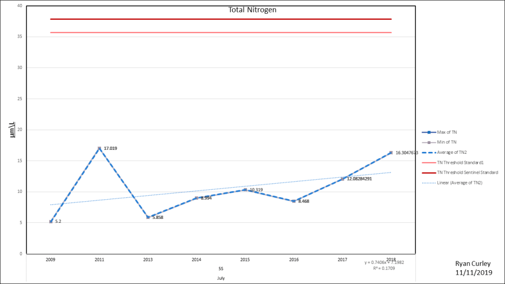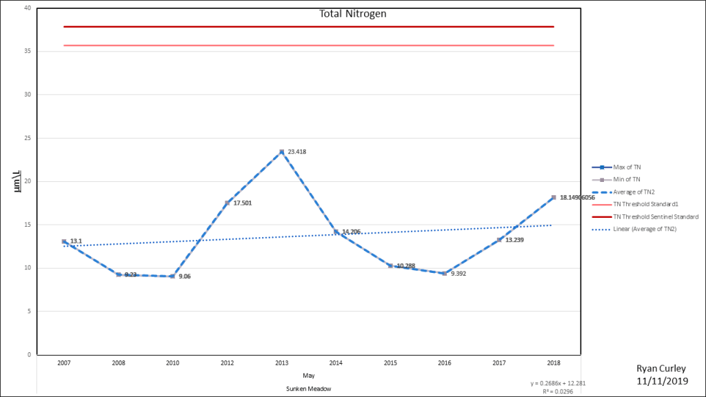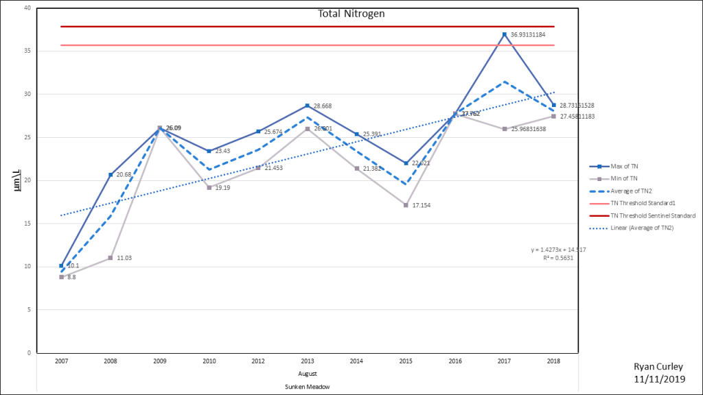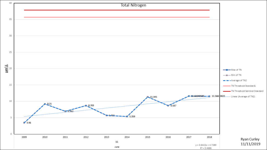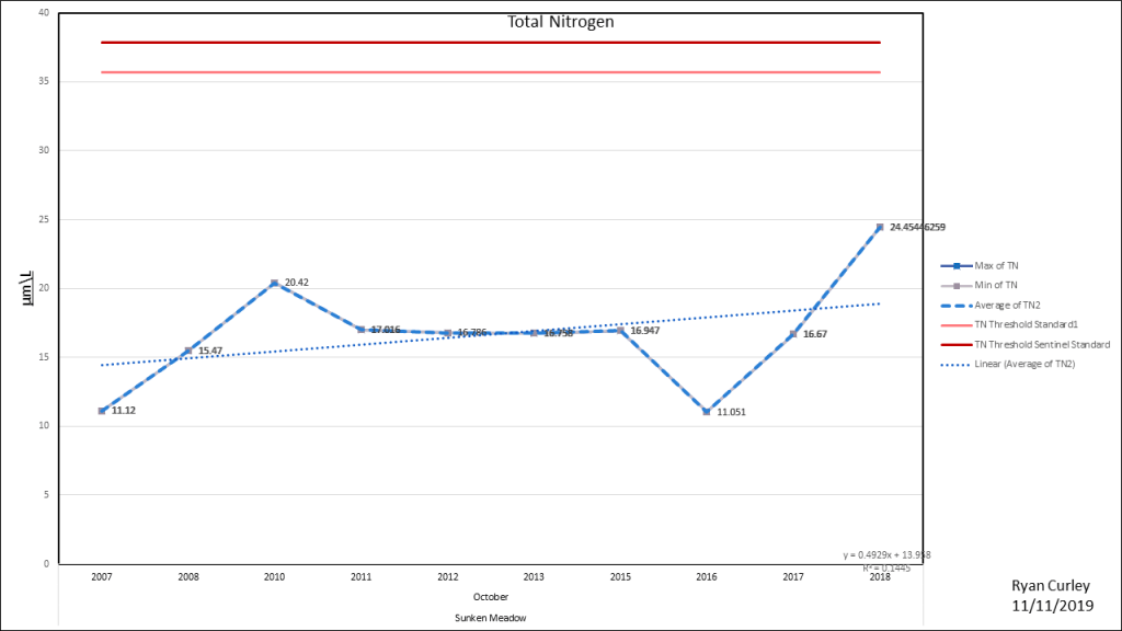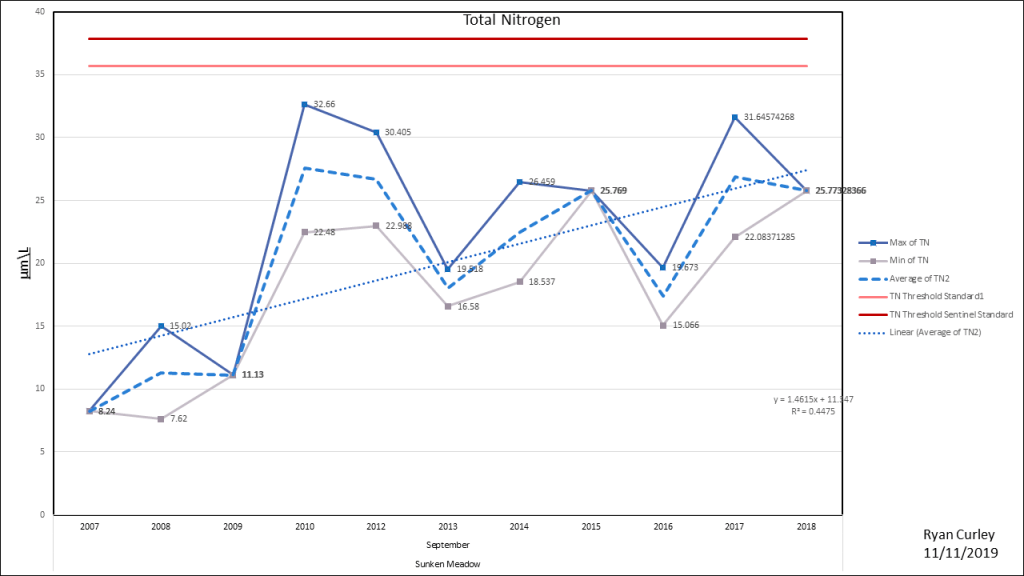 In general Total Nitrogen(TN) concentrations in excess of .50 mg/L are indicative of a nitrogen impaired water body. The center for Coastal Studies measures TN in micro-moles (μm). The Massachusetts Estuary Project (MEP) set the acceptable nitrogen concentrations for Welfleet Harbor. The threshold level for MEP for some parts of the Harbor is .53 mg/l which corresponds to a value of 37.86 μm/l other parts of the harbor threshold is .50mgl (35.71μm/l) which is the standard level when measuring eutrophication. For the sake of making this measurement easier to understand it is displayed as μm/L (micromoles per litter). This is redundant as μm is the same as μm/L. However μml/L is more accessible to a layperson because it provides a point of reference. These graphs use a light red line that represents .50mg/l and a dark red line for .53mg/l.