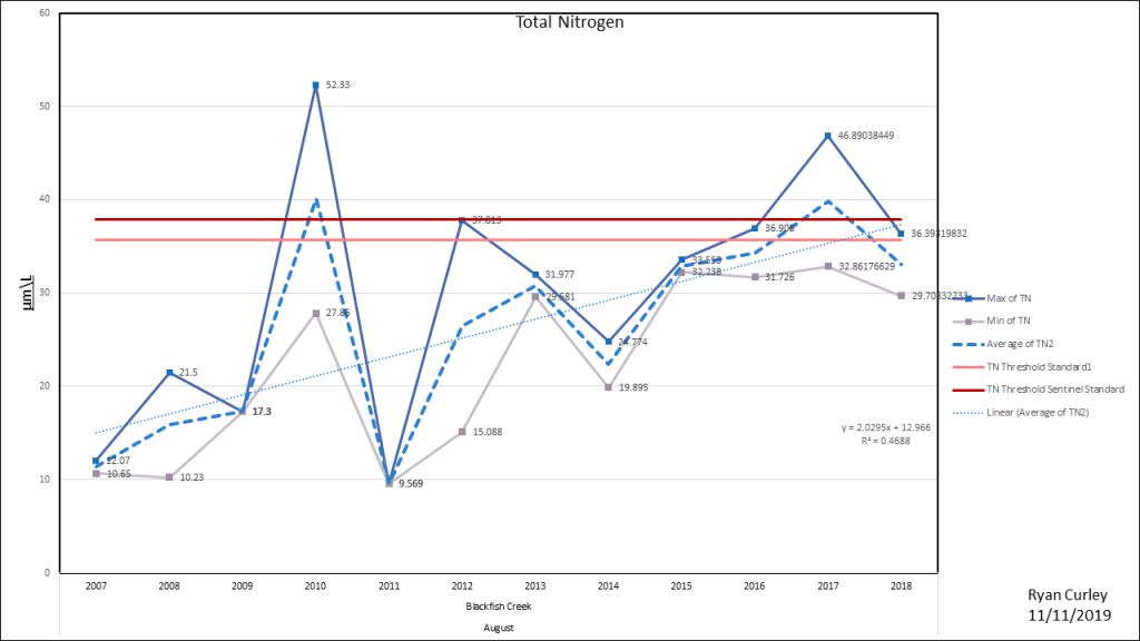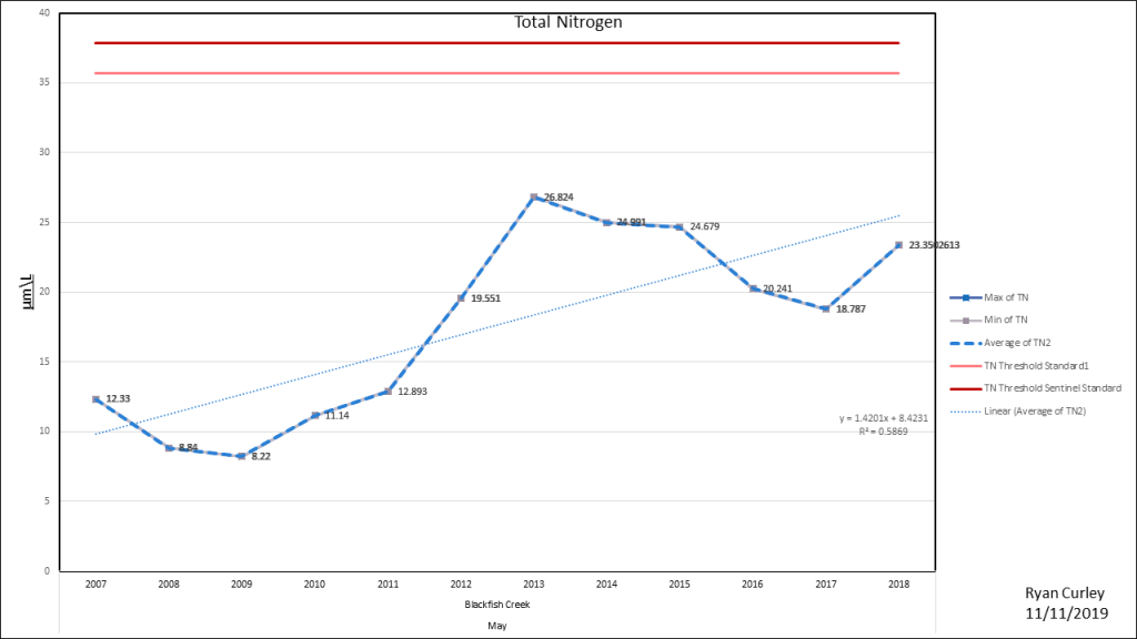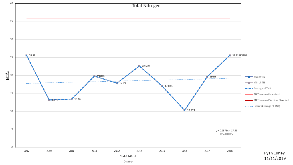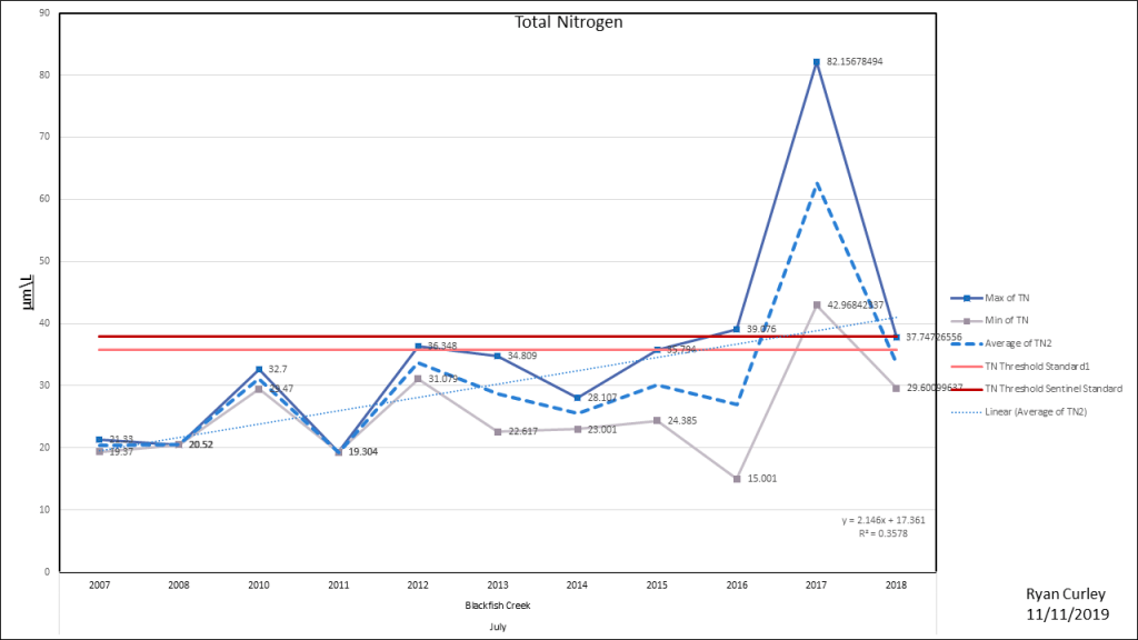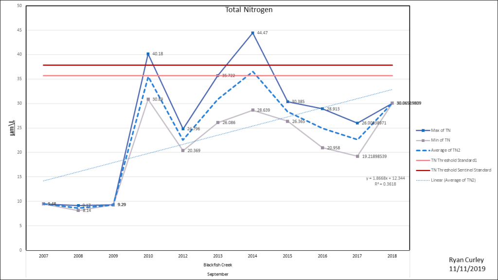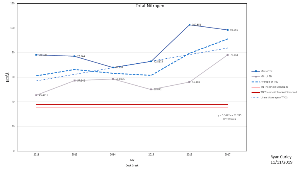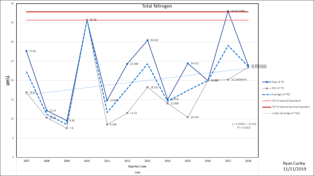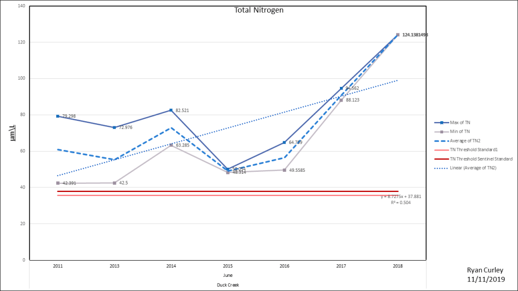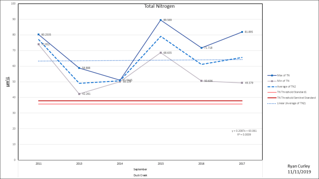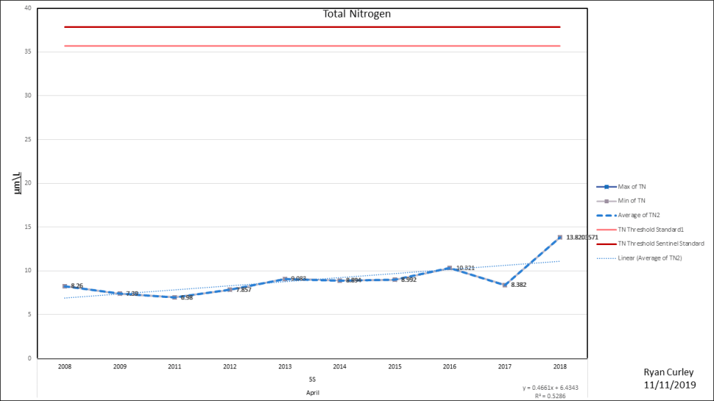 In general Total Nitrogen(TN) concentrations in excess of .50 mg/L are indicative of a nitrogen impaired water body. The center for Coastal Studies measures TN in micro-moles (μm). The Massachusetts Estuary Project (MEP) set the acceptable nitrogen concentrations for Welfleet Harbor. The threshold level for MEP for some parts of the Harbor is .53 mg/l which corresponds to a value of 37.86 μm/l other parts of the harbor threshold is .50mgl (35.71μm/l) which is the standard level when measuring eutrophication. For the sake of making this measurement easier to understand it is displayed as μm/L (micromoles per litter). This is redundant as μm is the same as μm/L. However μml/L is more accessible to a layperson because it provides a point of reference. These graphs use a light red line that represents .50mg/l and a dark red line for .53mg/l.