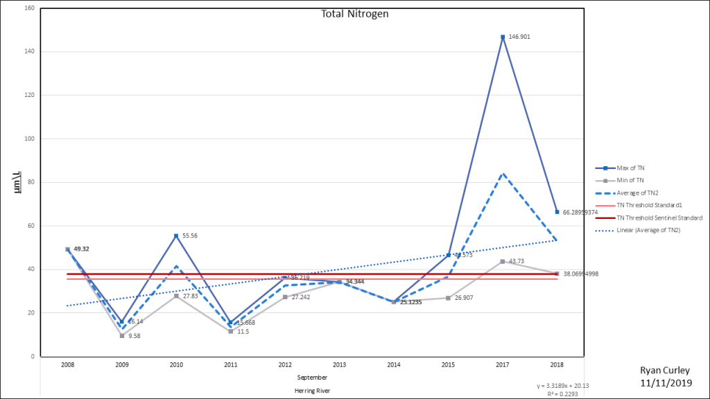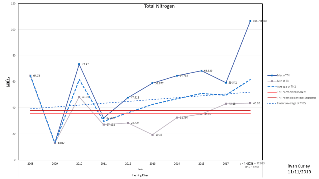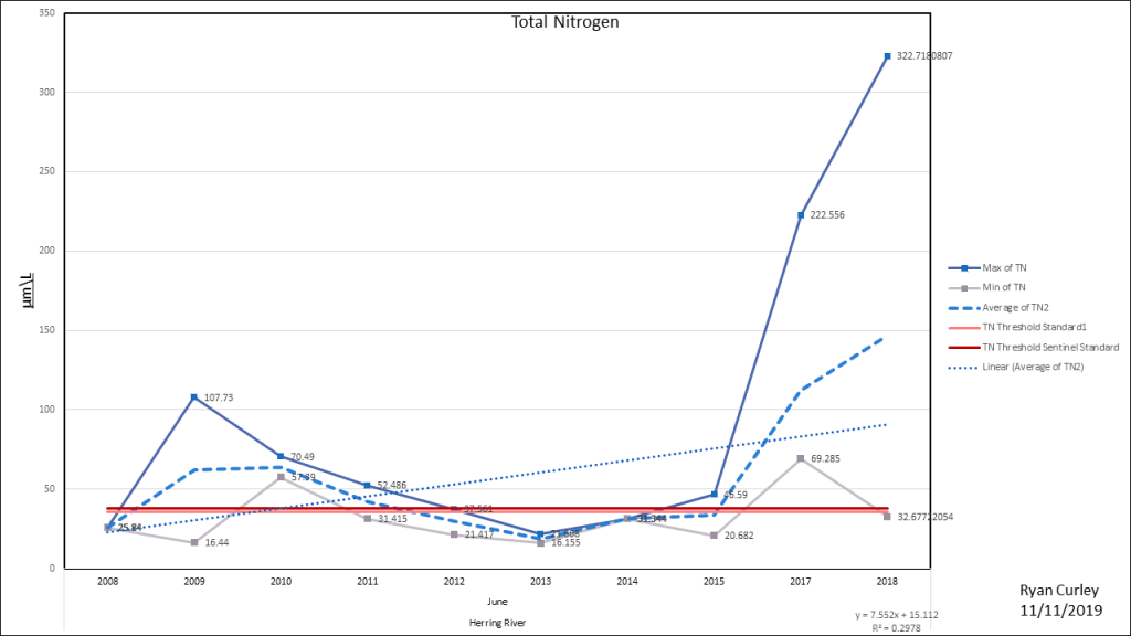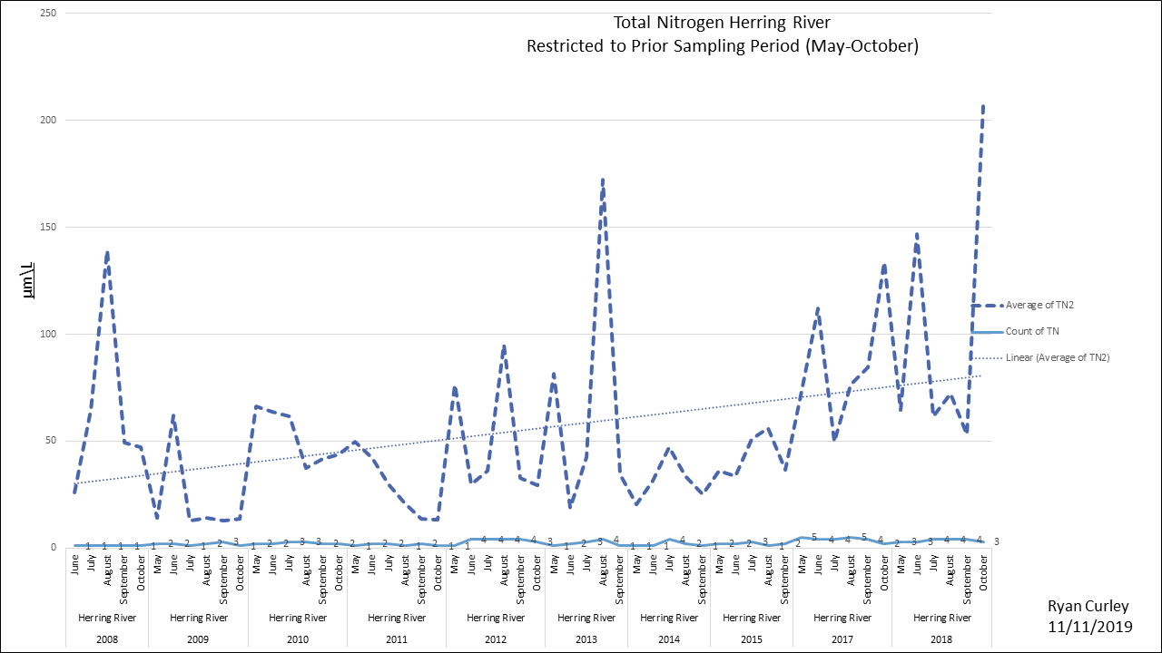 The Herring River is extremely variable. It’s total nitrogen concentrations are consistently increasing its peak TN concentrations are multiples of the what is seen elsewhere in the harbor.